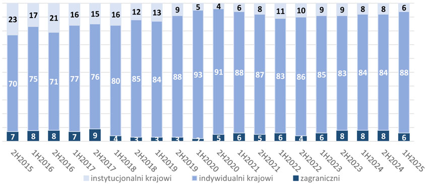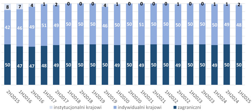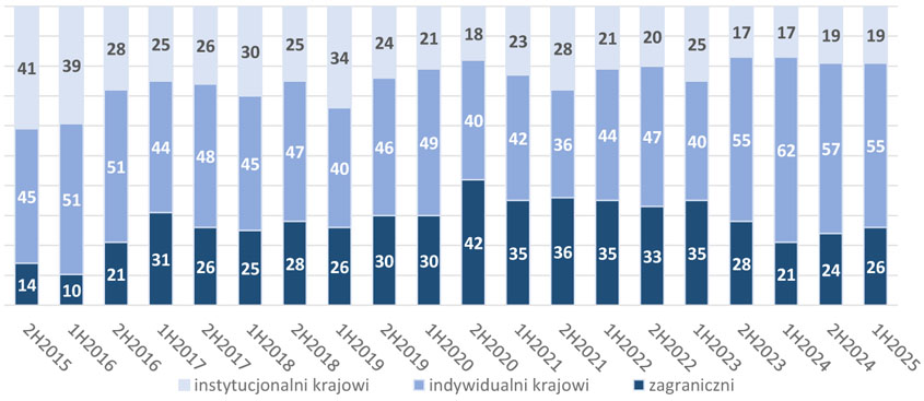 W pierwszym półroczu 2025 roku udział krajowych instytucji w obrotach wyniósł: TFI 21,7%, animatorzy 25,3%, inne podmioty instytucjonalne 26,3%.