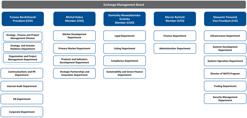 See moreThe highest authority of the Warsaw Stock Exchange is the General Meeting of Shareholders of the Exchange. All shareholders of the Exchange are given the right to attend the General Meeting. The competences of the General Meeting include, among others, changes to the Articles of the Association and the election of members of the Exchange Supervisory Board.