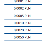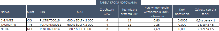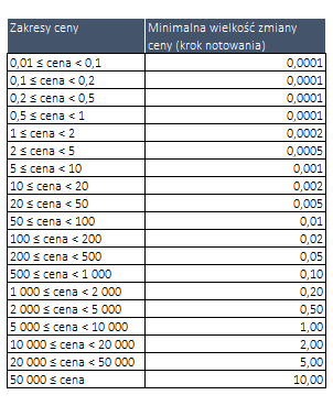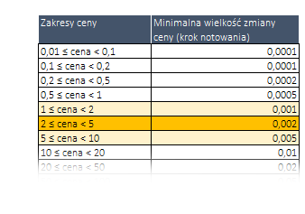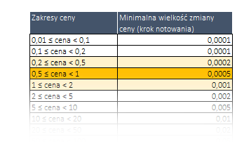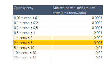 W przypadku prób składania zleceń poniżej 0,50 PLN, krok notowania będzie wynosił 0,0002 PLN. Natomiast dla zleceń równych i wyższych niż 1,00 PLN, krok notowania będzie wynosił 0,001 PLN.