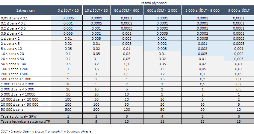 W przypadku akcji debiutujących, dla których nie ma wystarczających danych, aby dokonać szacowania ŚDLT, do czasu opublikowania przez właściwy organ średniej dziennej liczby transakcji stosuje się tymczasowe pasmo płynności, które odpowiada tabeli nr 6 z Uchwały GPW (odpowiadająca tabeli technicznej systemu UTP nr 13). Jest to pasmo przeznaczone dla instrumentów o najwyższej płynności. |