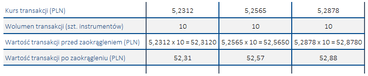 Rozliczenia i rozrachunek dokonywane są w złotych (PLN) z dokładnością do pełnych groszy. W tym celu każda zawarta transakcja musi zostać zaokrąglona zgodnie z poniższą metodologią: