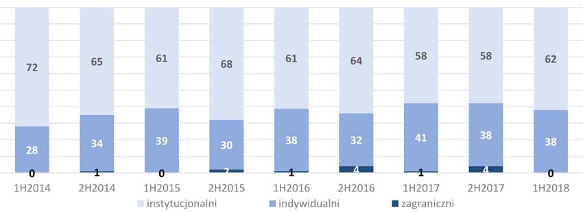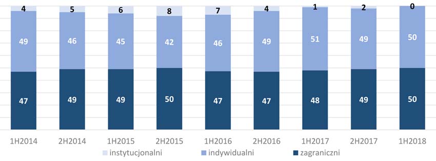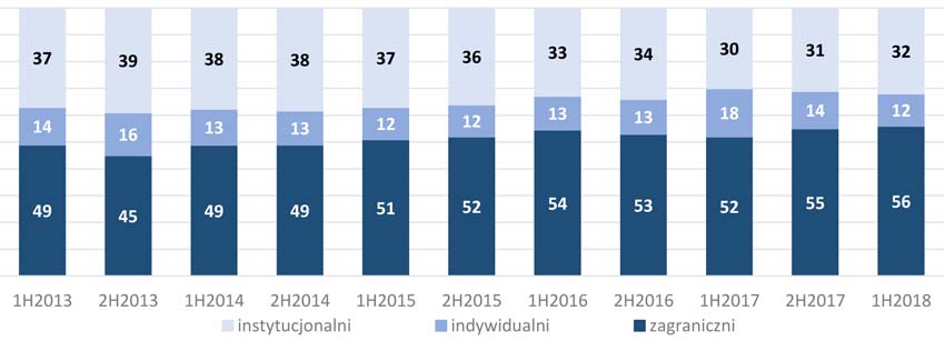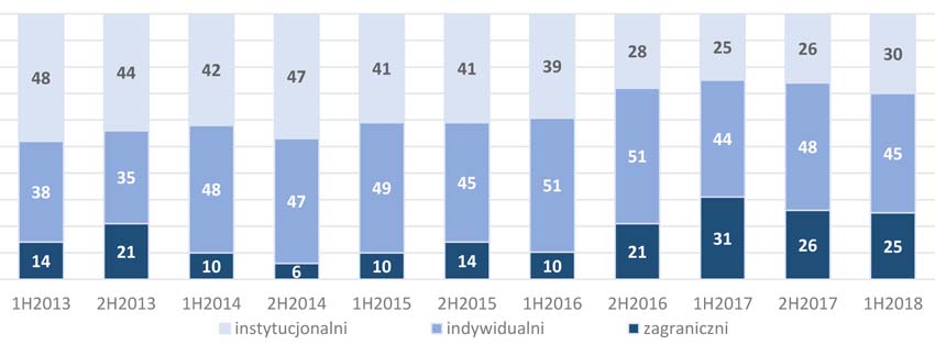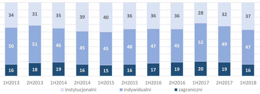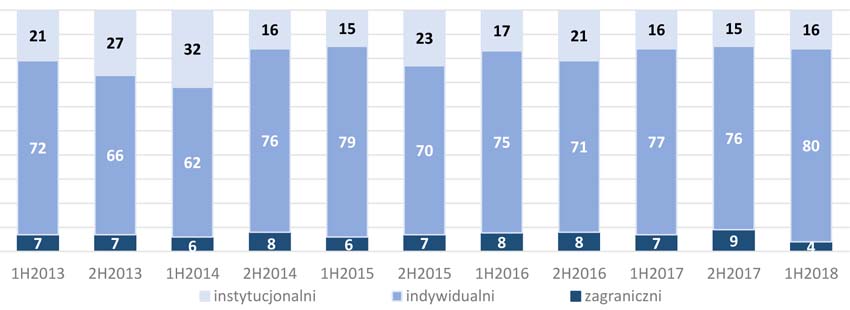 W I półroczu 2018 r. wśród krajowych instytucji dominowały TFI (udział na poziomie 31 proc.). Na drugim miejscu uplasowały się podmioty świadczące usługi animatorów (29 proc.), na trzecim otwarte fundusze emerytalne i członkowie giełdy działający na rachunek własny (po 14 proc.).