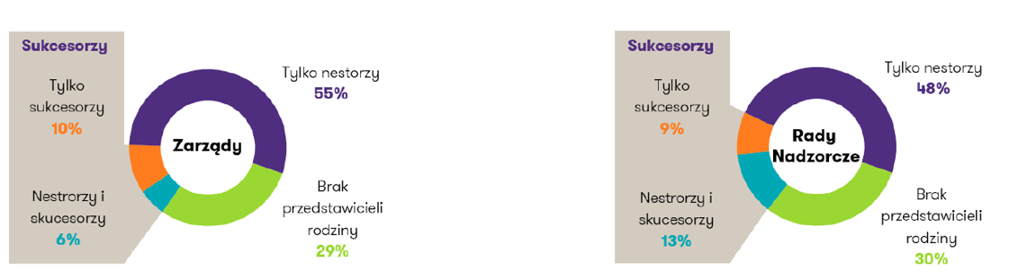 Sukcesorzy relatywnie rzadko są też obecni w najważniejszych organach spółek. Obecnie jedynie w co szóstej (16%) spółce rodzinnej przedstawiciel pokolenia sukcesorów zasiada w zarządzie, a w co piątej (22%) w radzie nadzorczej. Tymczasem aż połowa firm w zarządach i radach nadzorczych jako jedynego przedstawiciela rodziny posiada nestora (odpowiednio 55% i 48%).