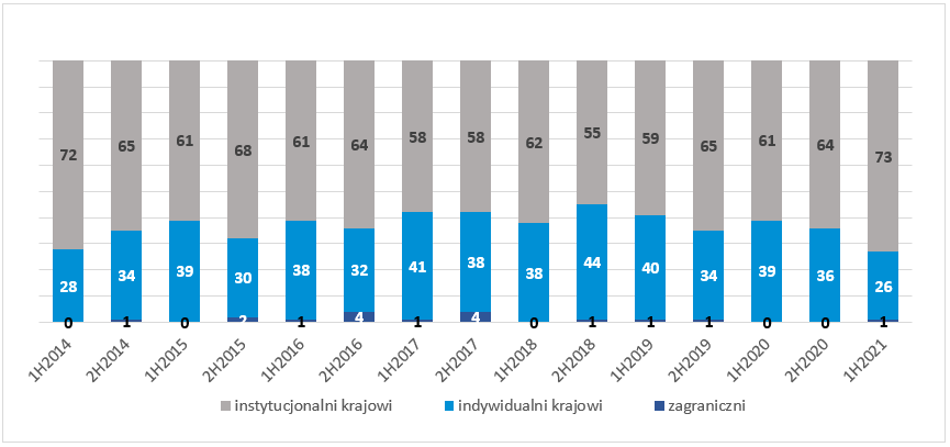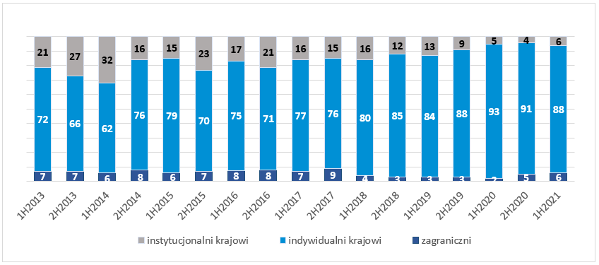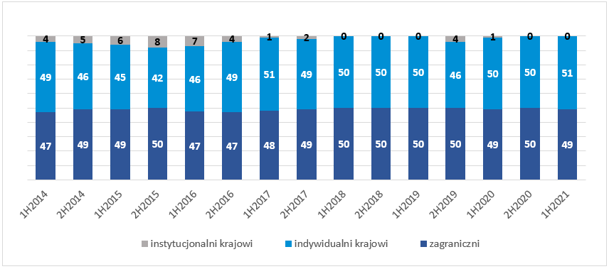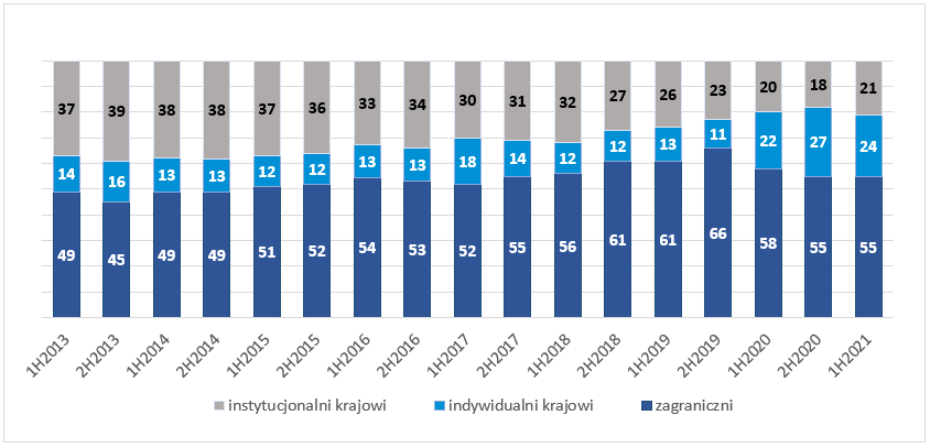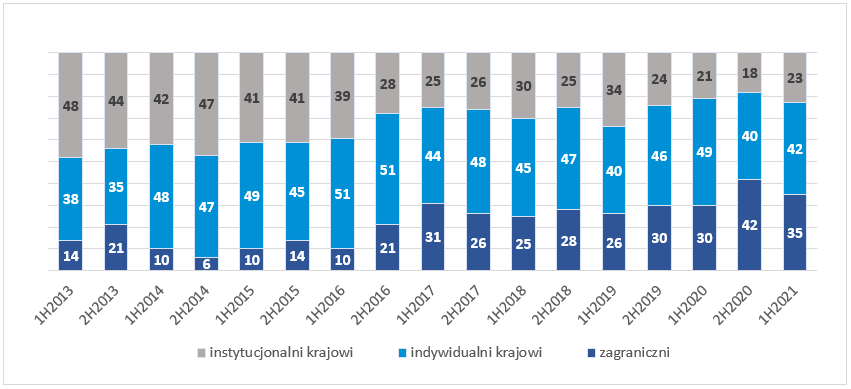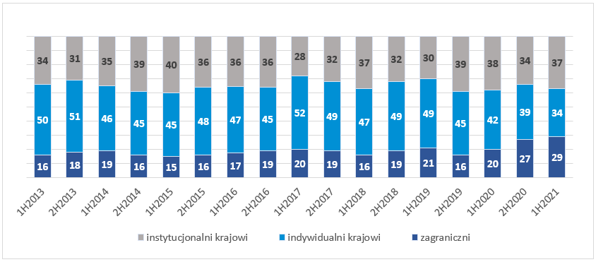 do 26 proc. w pierwszej połowie 2021 r. Udział inwestorów zagranicznych wzrósł do 1 proc. (+1 pp. rdr), natomiast inwestorów instytucjonalnych wzrósł o 12 pp. rdr do 73 proc., co stanowi rekord wyników