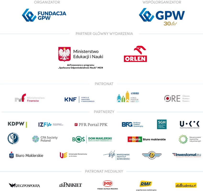 Realizację Dnia Edukacji Finansowej dofinansowano z programu „Społeczna Odpowiedzialność Nauki” Ministerstwa Edukacji i Nauki. Współorganizatorem jest Giełda Papierów Wartościowych w Warszawie. Patronat nad wydarzeniem objęło Ministerstwo Finansów, Komisja Nadzoru Finansowego oraz Ośrodek Rozwoju Edukacji. Partnerem głównym wydarzenia jest PKN ORLEN. Partnerami Dnia Edukacji Finansowej będą: Krajowy Depozyt Papierów Wartościowych, PFR Portal PPK, Bankowy Fundusz Gwarancyjny, Izba Zarządzających Funduszami i Aktywami, Urząd Ochrony Konkurencji i Konsumentów, Stowarzyszenie Inwestorów Indywidualnych, Warszawski Instytut Bankowości, CFA Society Poland, Szkoła Główna Handlowa, Uniwersytet Ekonomiczny we Wrocławiu, Wydział Psychologii Uniwersytetu Warszawskiego, Biuro Maklerskie PKO Banku Polskiego, Biuro Maklerskie mBanku oraz Dom Maklerski Banku Ochrony Środowiska. Patronat medialny nad wydarzeniem objęły: Rzeczpospolita i Gazeta Giełdy Parkiet, Polska Agencja Prasowa, RMF oraz dlaStudenta.pl.