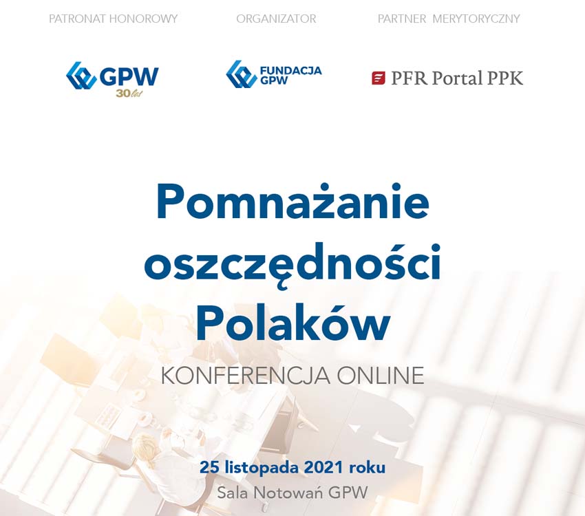 Fundacja GPW zaprasza wszystkich zainteresowanych do udziału w konferencji „Pomnażanie oszczędności Polaków: wyniki inwestycyjne w PPK, rola edukacji finansowej uczestników rynku kapitałowego i GPW”.
