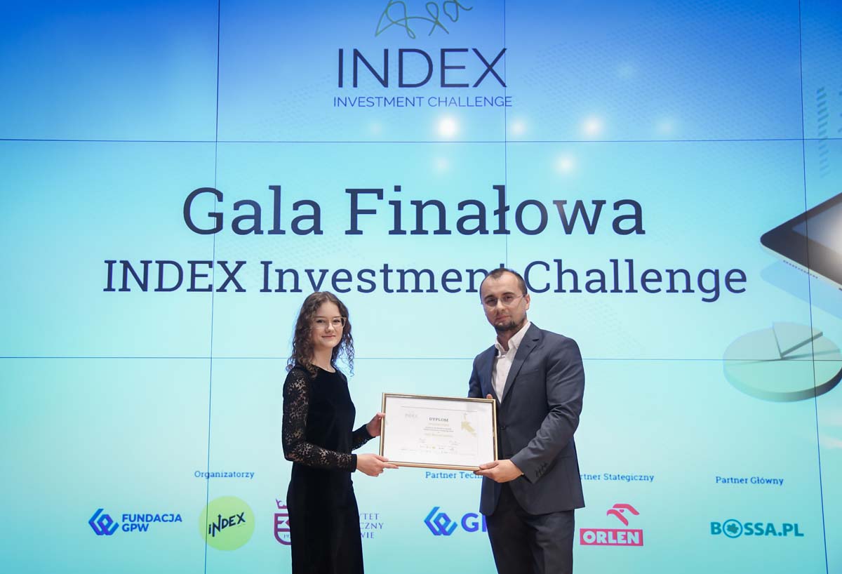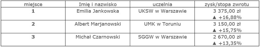 - Główną nagrodę w konkursie odebrała Emilia Jankowska z Uniwersytetu Kardynała Stefana Wyszyńskiego w Warszawie, która osiągnęła stopę zwrotu wynoszącą 23,18%