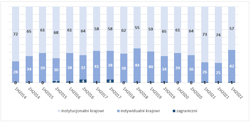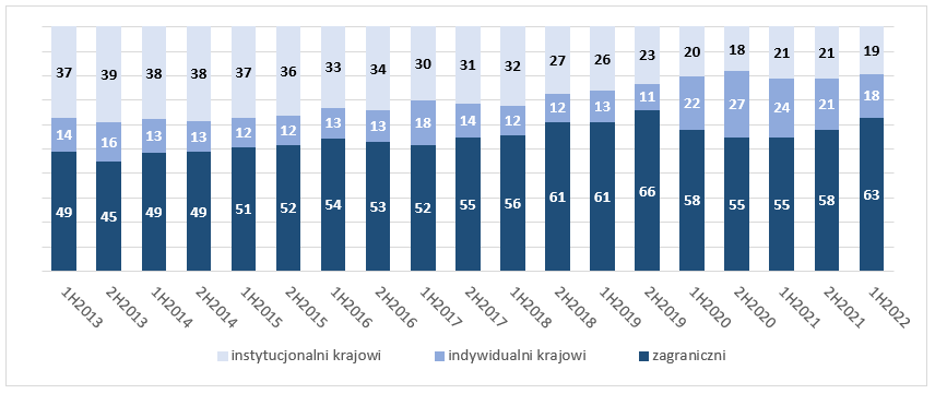 - W I półroczu 2022 r. inwestorzy zagraniczni wygenerowali 63 proc. obrotów na Głównym Rynku (GR) akcji GPW (+8 pp. rdr) - to rekordowy udział za pierwsze półrocze w ciągu ostatniej dekady. Krajowi inwestorzy indywidualni odpowiadali za 18 proc. obrotów (-6 pp. rdr), a instytucjonalni – za 19 proc. (-2 pp. rdr)