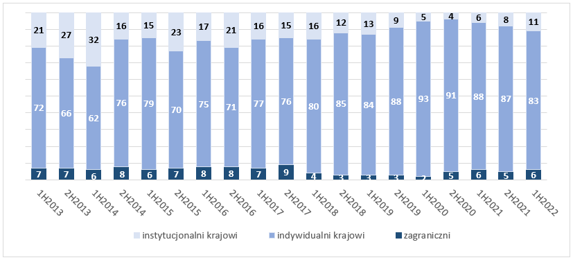 - Na rynku NewConnect prym nadal wiodą inwestorzy indywidualni, których udział w obrotach wyniósł 83 proc. (-5 pp. rdr). Wzrósł udział inwestorów instytucjonalnych do 11 proc. (+5 pp. rdr). Udział inwestorów zagranicznych, w porównaniu do I połowy 2021 r. nie zmienił się i wyniósł 6 proc.