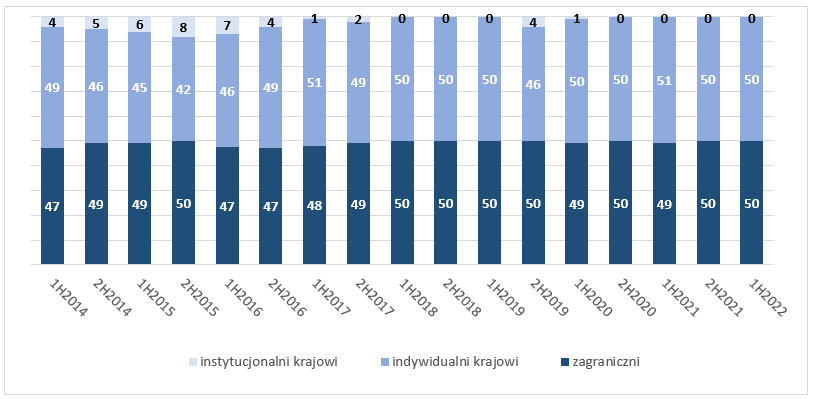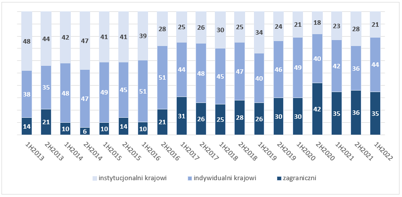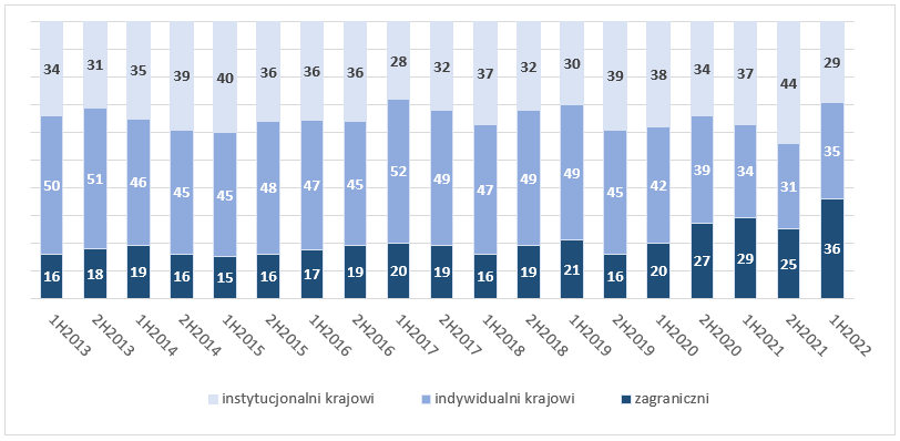W I połowie 2022 r. na Głównym Rynku akcji GPW największy udział w obrocie mieli inwestorzy zagraniczni. Wyniósł on 63 proc., o 8 pp. więcej w porównaniu z poprzednim rokiem. Był to najwyższy udział w pierwszym półroczu w ciągu ostatnich 10 lat. Krajowi inwestorzy indywidualni wygenerowali 18 proc. obrotów, co stanowiło spadek o 6 pp. w stosunku do poprzedniego roku. Krajowi inwestorzy instytucjonalni wygenerowali 19 proc. obrotów, o 2 pp. mniej niż w I połowie 2021 r. W I półroczu 2022 r. wśród krajowych instytucji na pierwszym miejscu, z takim samym udziałem na poziomie 27,5 proc., znaleźli się animatorzy oraz inne podmioty instytucjonalne, na trzecim miejscu uplasowały się firmy (17,5 proc.).