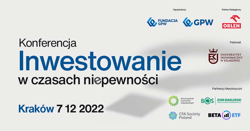 Fundacja GPW oraz Giełda Papierów Wartościowych zapraszają do udziału w konferencjach regionalnych organizowanych pod hasłem „Inwestowanie w czasach niepewności”. Pierwsza konferencja z tego cyklu odbędzie się w Lublinie w dniu 23 listopada br. w sali konferencyjnej IBB Grand Hotel. Kolejna edycja wydarzenia planowana jest w Krakowie w dniu 7 grudnia br., a następne odbędą się w pierwszym kwartale 2023 r. O terminach i miejscach konferencji będziemy sukcesywnie informować na stronach GPW i Fundacji GPW.
