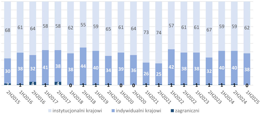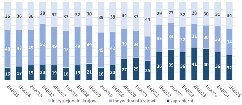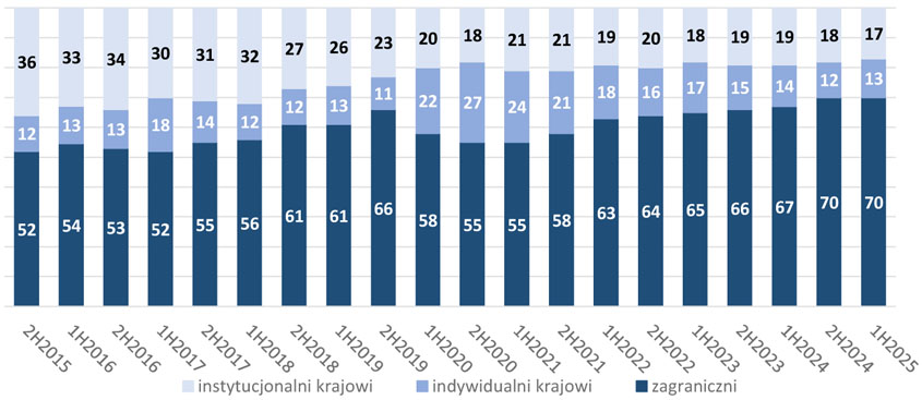 W pierwszym półroczu 2025 roku udział krajowych instytucji w obrotach wyniósł: TFI 21,7%, animatorzy 25,3%, inne podmioty instytucjonalne 26,3%.