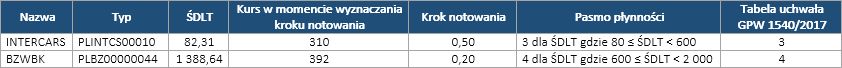 Na podstawie szacowania ŚDLT dla akcji spółek INTERCARS oraz BZWBK została wyznaczony krok notowania, jak poniżej: