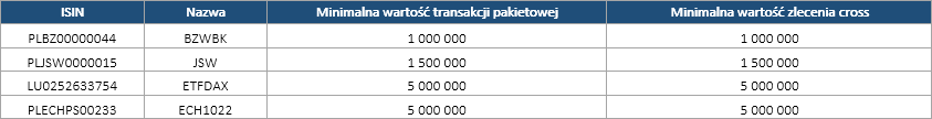 W przypadku płynnych instrumentów wartość zlecenia cross nie może być mniejsza niż minimalna wartość transakcji pakietowej. Przykład wybranych instrumentów płynnych wraz z określoną minimalna wartością transakcji pakietowej oraz wartością zlecenia cross: