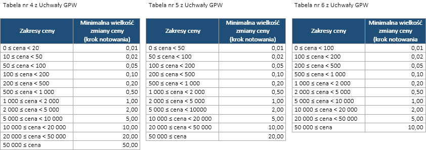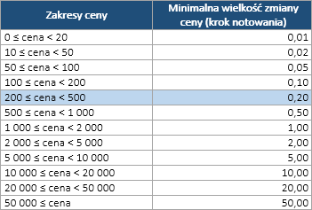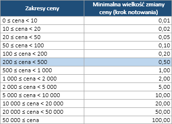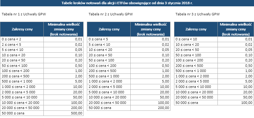Na stronie internetowej GPW (zobacz) jest dostępna tabela, która zawiera informacje na temat minimalnych kroków notowań dla kursów akcji i ETF.