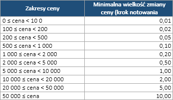 Definicje minimalnych kroków notowań dla poszczególnych grup dostępne są w tym miejscu (zobacz)