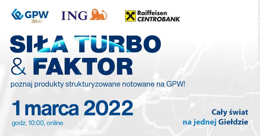 Zapraszamy do wzięcia udziału w webinarze „SIŁA TURBO & FAKTOR” – poznaj produkty strukturyzowane notowane na GPW!” organizowanym wspólnie z Grupą ING oraz Raiffeisen Centrobank AG. Start: 1 marca 2022 r. o godz. 10:00.