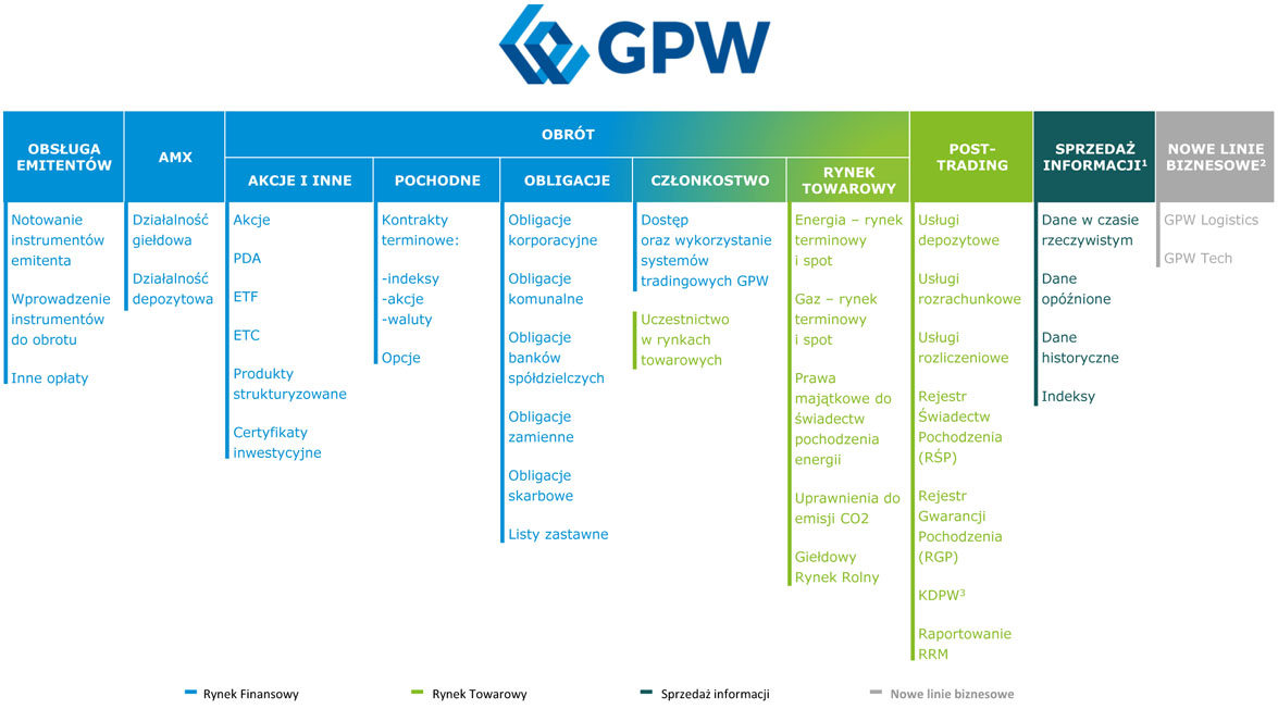 Usługi posttransakcyjne dla rynku finansowego prowadzonego przez GPW i BondSpot, w skład których wchodzą usługi depozytowe, rozliczeniowe i rozrachunkowe, oferowane są przez spółkę stowarzyszoną GPW – Krajowy Depozyt Papierów Wartościowych S.A. (KDPW) i jej spółkę zależną KDPW_CCP S.A. Rozliczenia transakcji zawartych przez Członków TGE na poszczególnych rynkach prowadzi Izba Rozliczeniowa Giełd Towarowych (IRGiT), spółka zależna TGE. Przedmiotem rozliczeń są transakcje na towary giełdowe oraz instrumenty finansowe niebędące papierami wartościowymi. IRGiT rozlicza cały wolumen energii elektrycznej i gazu sprzedawany w Polsce na rynku giełdowym. Wykorzystując nowoczesne systemy informatyczne i autorski model rozrachunku IRGiT prowadzi także rozliczenia i rozrachunek transakcji zawieranych na Rynku Instrumentów Finansowych (RIF) TGE, gdzie przedmiotem obrotu są kontrakty terminowe na indeks TGe24 oraz instrumenty finansowe bazujące na gazie.