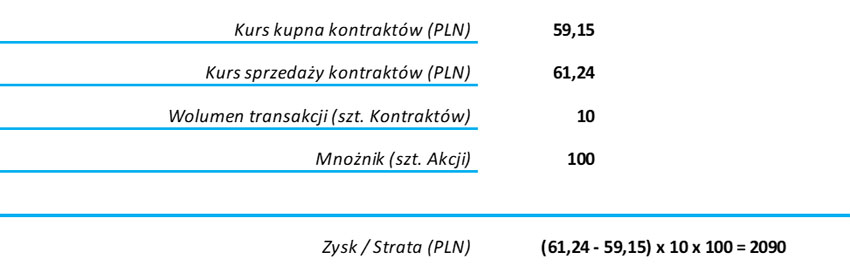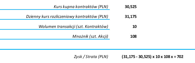 Należy przy tym pamiętać, że w przypadku operacji na akcjach stanowiących instrument bazowy dla kontraktów terminowych takich jak prawo poboru, zmiana wartości nominalnej czy prawo do dywidendy nadzwyczajnej, mnożnik może ulec zmianie i może być inny niż 1 lub 10 lub 100 czy 1000 akcji. Możliwe są niestandardowe wysokości mnożnika jak np. 102 czy 108 akcji. Ponieważ w takim przypadku obliczając rezultat z inwestycji w kontrakty terminowe możemy uzyskać wynik z dokładnością większą niż jeden grosz dlatego konieczne jest matematyczne zaokrąglenie tego wyniku do pełnego grosza. Zaokrąglany jest wynik z inwestycji przypadający na 1 kontrakt terminowy. Szczegóły w przykładzie poniżej.
