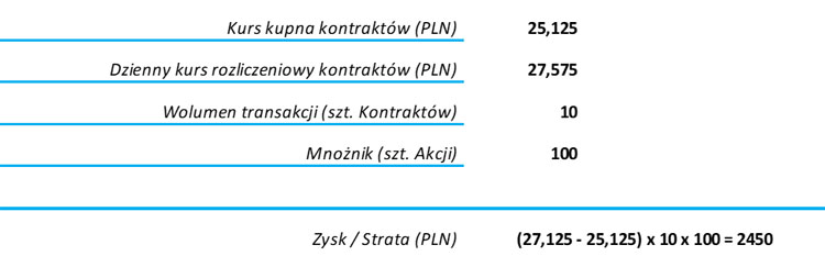 Ustalenie wyniku z inwestycji w kontrakty terminowe na akcje po zmianie kroku notowania z zastosowaniem dziennego kursu rozliczeniowego. Dotyczy sytuacji, w której po otwarciu pozycji w kontrakcie pozycja ta jest utrzymywana przez kolejne sesje giełdowe. Przykładowa inwestycja polega na kupnie 10 kontraktów terminowych. Przyjmujemy, że mnożnik w kontrakcie wynosi 100 akcji. Poniższe obliczenia dotyczą sesji, na której pozycja została otwarta.