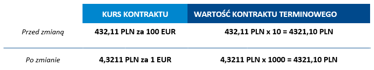Wielkość kontraktu czyli ilość jednostek danej waluty jaka przypada na jeden kontrakt terminowy pozostała bez zmiany i nadal wynosi 1000 jednostek waluty (1000 EUR, 1000 USD, 1000 GBP, 1000 CHF). Należy natomiast zwrócić uwagę, że zmienił się algorytm kalkulacji wartości kontraktu terminowego. Przed zmianą wartość kontraktu stanowiła kurs kontraktu przemnożony przez 10. Obecnie wartość kontraktu stanowi kurs kontraktu przemnożony przez 1000.