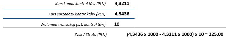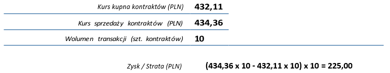 Ustalenie wyniku z inwestycji w kontrakt terminowy na EUR/PLN po zmianie kroku oraz jednostki notowania. Przykładowa inwestycja polegająca na kupnie 10 kontraktów terminowych i zamknięciu pozycji (sprzedaży kontraktów) na tej samej sesji giełdowej.