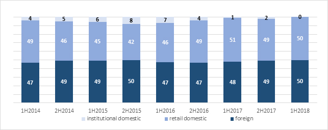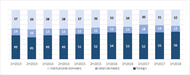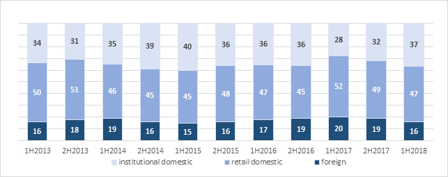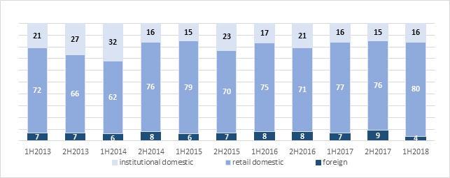 Domestic retail investors were in the lead also on the derivatives market in H1 2018. Their share in the volume of trade in futures was 47 percent, down by 5 percentage points year on year. Their share in trade on the option market was 45 percent. The share of domestic institutions and foreign investors in the volume of trade in futures was 37 percent and 16 percent, respectively, in H1 2018. Foreign investors accounted for 25 percent of trade in options in H1 2018 while institutional investors generated 30 percent of the trade.