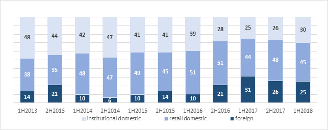 Individual investors accounted for one half of the trade in structured instruments in H1 2018 while foreign investors accounted for the other half.