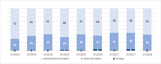 The share in trade in bonds on Catalyst has been stable for four years, ever since the survey started to include bonds. The main share is that of domestic institutions at 62 percent in H1 2018, up by 4 percentage points year on year. Individual investors accounted for 38 percent of trade while foreign investors pulled out of the market (-4 percentage points year on year in H1 2018).