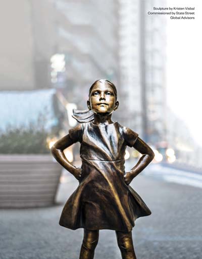 Commissioned by State Street Global Advisors and created by sculptor Kristen Visbal, Fearless Girl was originally installed on Wall Street on the eve of International Women’s Day 2017, accompanied by a call on the companies in which State Street Global Advisors invests to increase the number of women on their corporate boards. She moved to her new home in 2018 in front of the New York Stock Exchange — continuing to inspire people around the world.