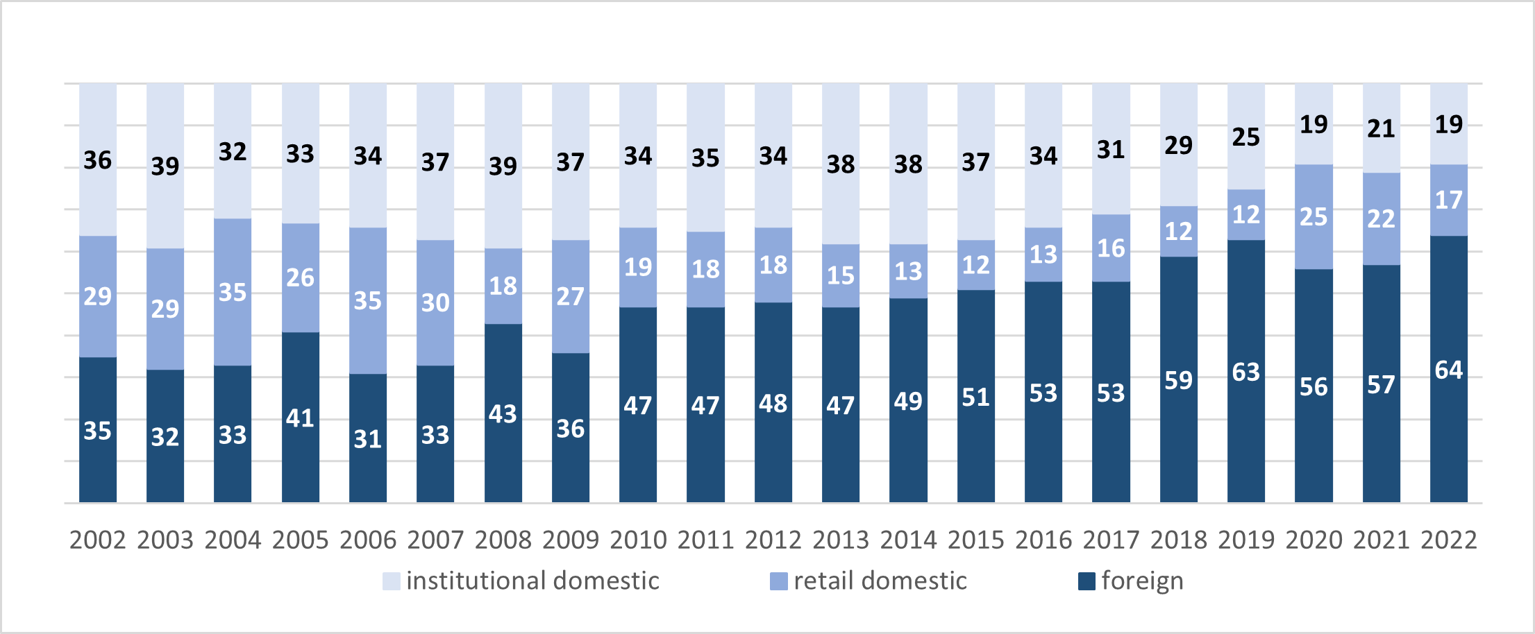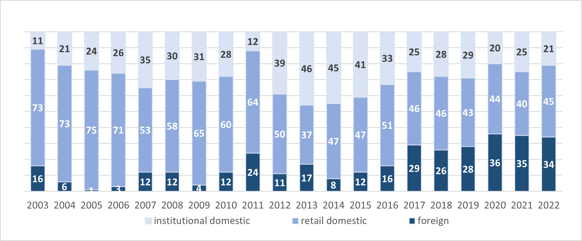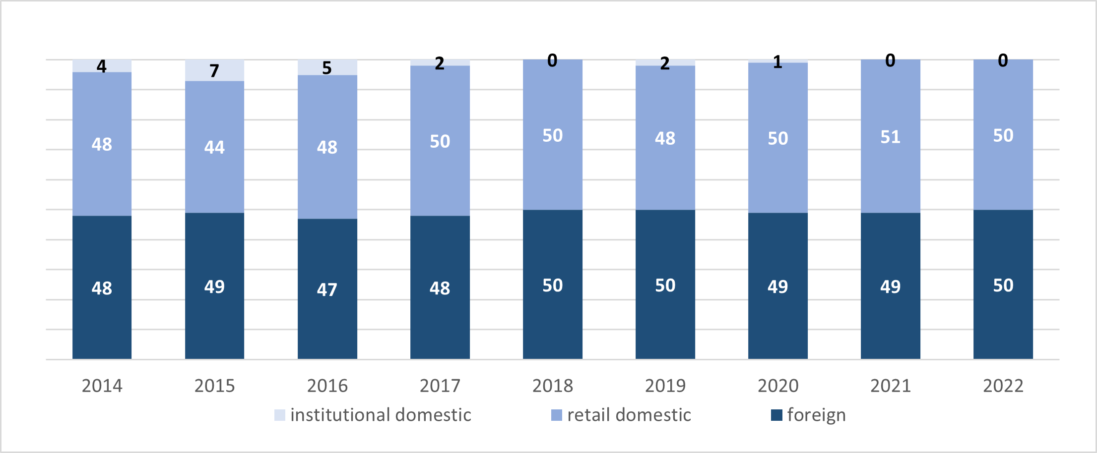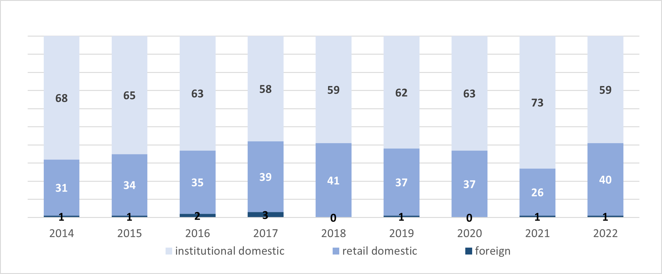 Other institutions[1] (with a share of 29.4 percent) were the leading group of domestic institutions in H2 2022, followed by market makers (27.4 percent) and firms[2] (17 percent).