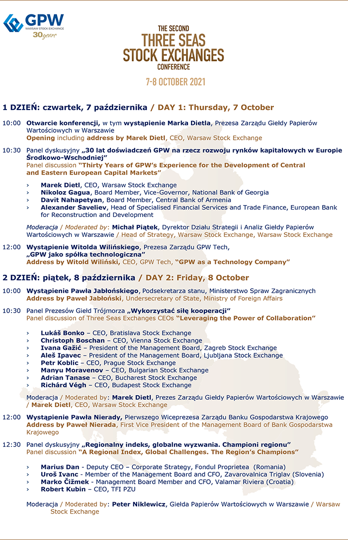Dear Madam or Sir, You are kindly invited to watch the webcast of the Second Three Seas Stock Exchanges Conference held on 7-8 October 2021. The event focuses on co-operation of the Three Seas Region capital markets. Panel speakers will exchange their experience with information technology and related products. The event brings together among others: