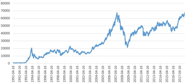 Wykres 1. Notowania indeksu WIG w okresie 16.04.1991-23.01.2018 (w pkt)